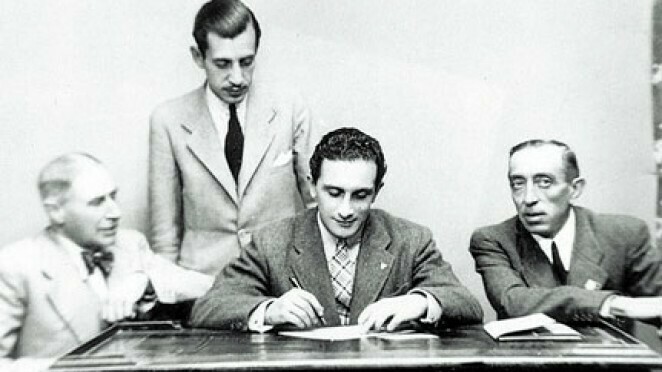 En el año 34, la decadencia de los delanteros del equipo, Samitier y Olivares, dejaron un vacío en la punta del ataque. Fernando Sañudo, terminados sus estudios de Derecho, regresaba a su Torrelavega natal a incorporarse a los negocios familiares, que por aquel momento estaban en auge. Pablo Hernández de Coronado, directivo blanco, se personó en su casa, y tras duras negociaciones, fue capaz de convencerle gracias, entre otras cosas, a ofrecerle un despacho en el prestigioso bufete de abogados de Garrigues. Nada más llegar, cuentan las malas lenguas que Joaquín Garrigues le dijo: «sólo le pido una cosa, no me tire las colillas al suelo». «Pudo ser verdad – rememora su hijo – mi padre era un fumador empedernido, por eso nos dejó antes de tiempo».