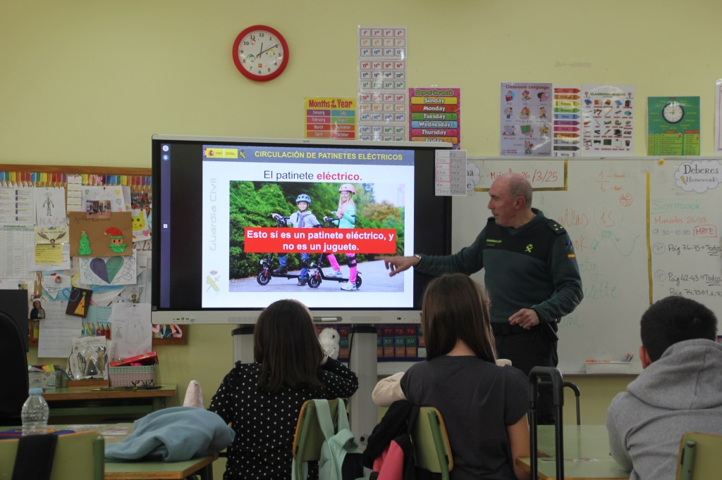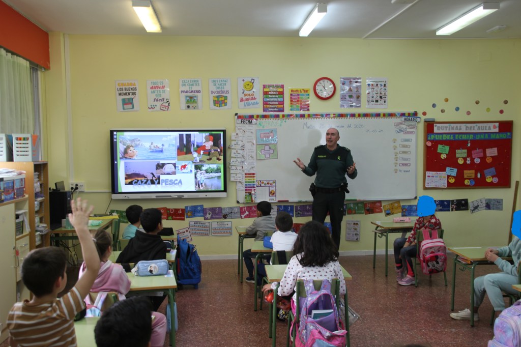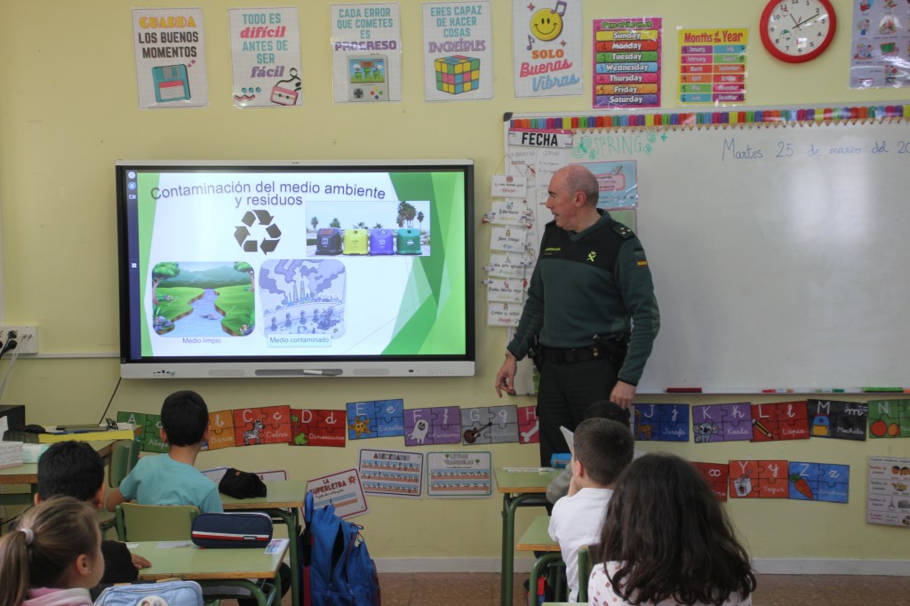 Entramos en el aula de 1º y 2º de primaria. El capitán comienza presentándose y dando a conocer la rama de Seguridad y Protección del Medio Ambiente (Seprona), dentro de la Guardia Civil. Los niños quedan encantados con las motocicletas, todoterrenos, lanchas, perros, caballos y helicópteros de los que dispone el cuerpo para lograr sus objetivos de preservar el medio ambiente.